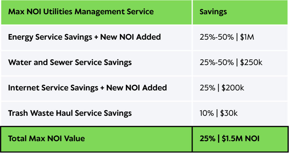 Reduce Operation Expenses (OpEx) without CapEx on 4 Utilities - Energy, Water, Internet and Trash using our Management Service. Maximizing NOI Profit and Operations Efficiency for your Properties.